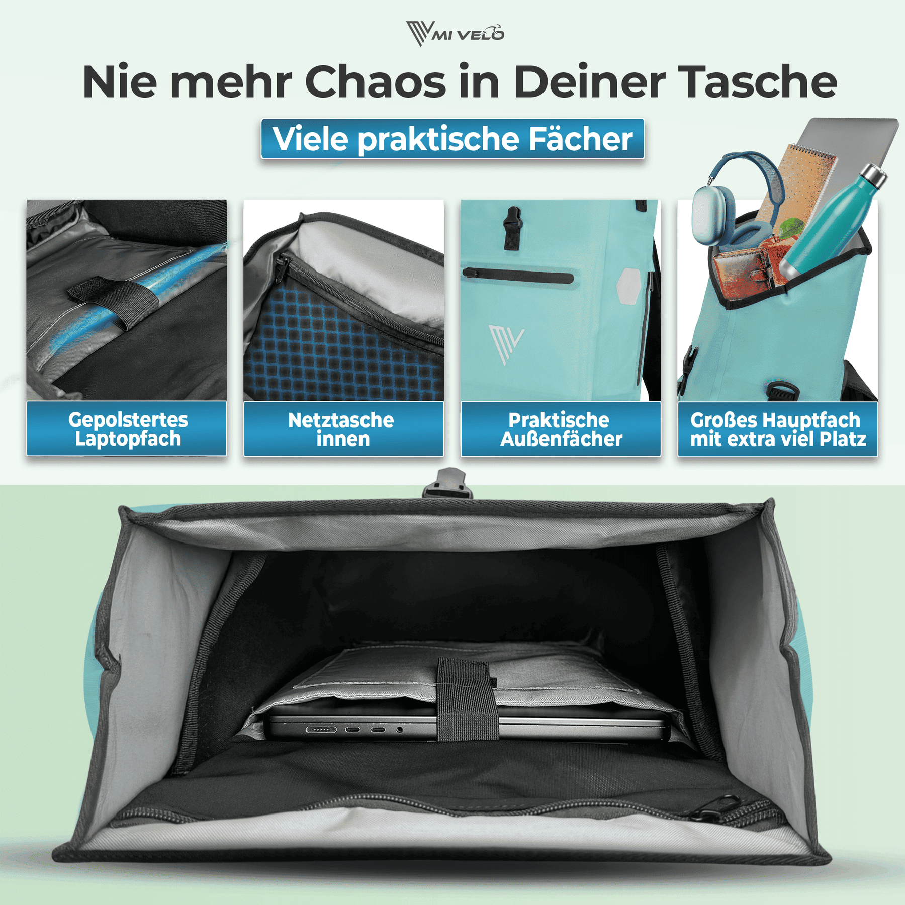 Foldtop-Verschluss für schnellen Zugriff. Mit gepolstertem Laptopfach und